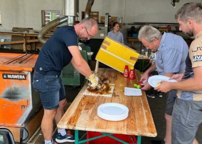 Written by KÖLBL European Tonewood, 28. July 2023我们的传统——放假之前的庆祝每年,公司暑假前的最后一个工作日,都是我们坐下来放松和享受美食饮料的时候。7月27日,星期四,放假的前一天。这天的“烧烤师傅”,Peter Sexlinger为我们提供了完美的烤鸡。此外,还有各种沙拉和面包卷。甜点店老板还为我们提供了蛋糕和甜点。非常感谢所有帮助我们一起举办这个愉快派对的人们。桌上的枪钉棒游戏,有趣而刺激。所有员工及其家人一起度过了愉快的一天。23年8月23日开工见,祝我们以愉快的心情和饱满的精神恢复工作。 背部